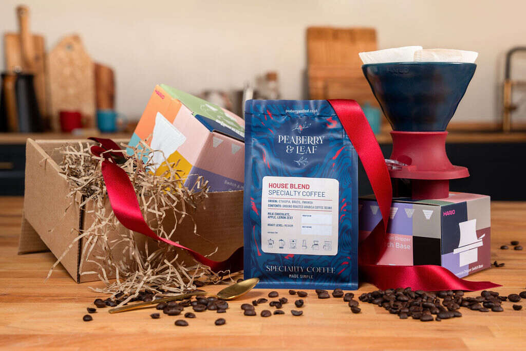 Give the coffee lover in your life something truly special. A 250g flavour-packed bag of our Specialty grade House Blend coffee with the versitile Hario V60 Switch & Match brewing kit in Navy and Cranberry Red. Complete with 100 Hario V60 brewing papers, this gift bundle has everything needed to create fantastic, flavour cups of coffee at home.